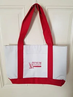 Carry a piece of our community with you! This stylish and durable tote bag features the Bynum Front Porch logo, making it perfect for everyday errands, beach trips, or farmers' market visits. Made from high-quality, eco-friendly materials, it's both practical and a great way to show your support for our local initiatives. Ideal for carrying your essentials with a touch of community spirit! Just $15 plus $4.95 shipping.